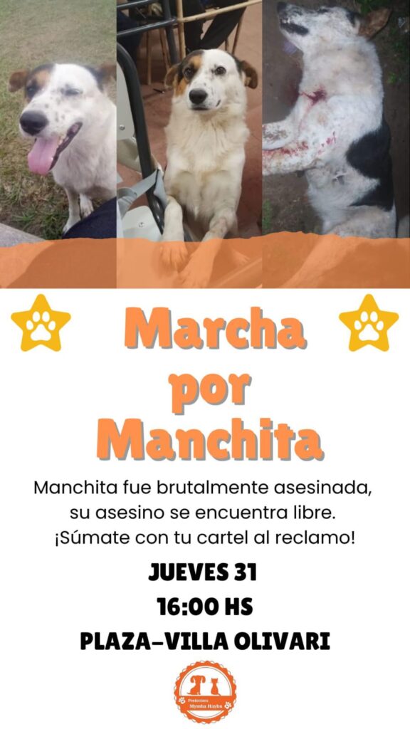 Este jueves la comunidad de Villa Olivari realizará una marcha “MARCHA POR MANCHITA” organizada por la fundación protectora de animales Mymba. Mirta Encinas conto a Cadena 4 y a nuestro medio el hecho que genera indignación en los vecinos, según Mirta, se quiso radicar una denuncia en la policía pero solo le tomaron una exposición y cuyos testigos fueron los chicos de la escuela primaria