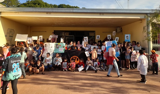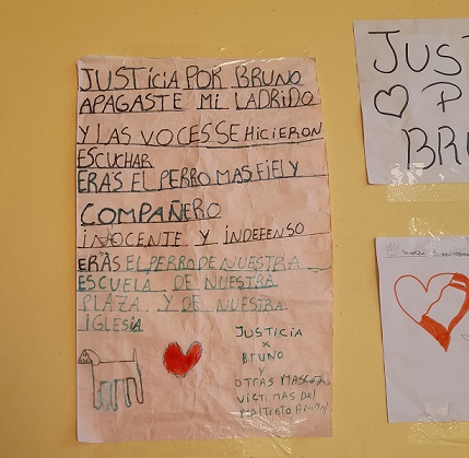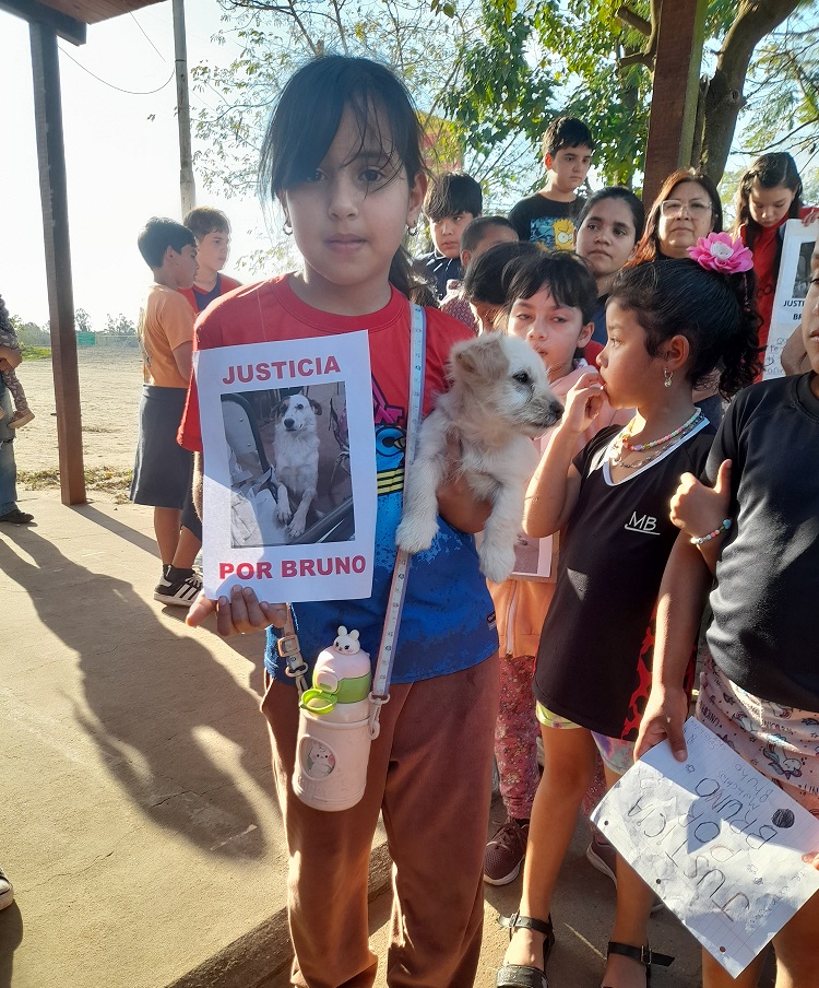 Los niños de la escuela acompañado por los padres mostraron carteles con leyendas que movilizan y dejan claro el pedido de justicia y para que aparezca el responsable de la muerte del animas que se había transformado en una mascota de los chicos de la escuela primaria
