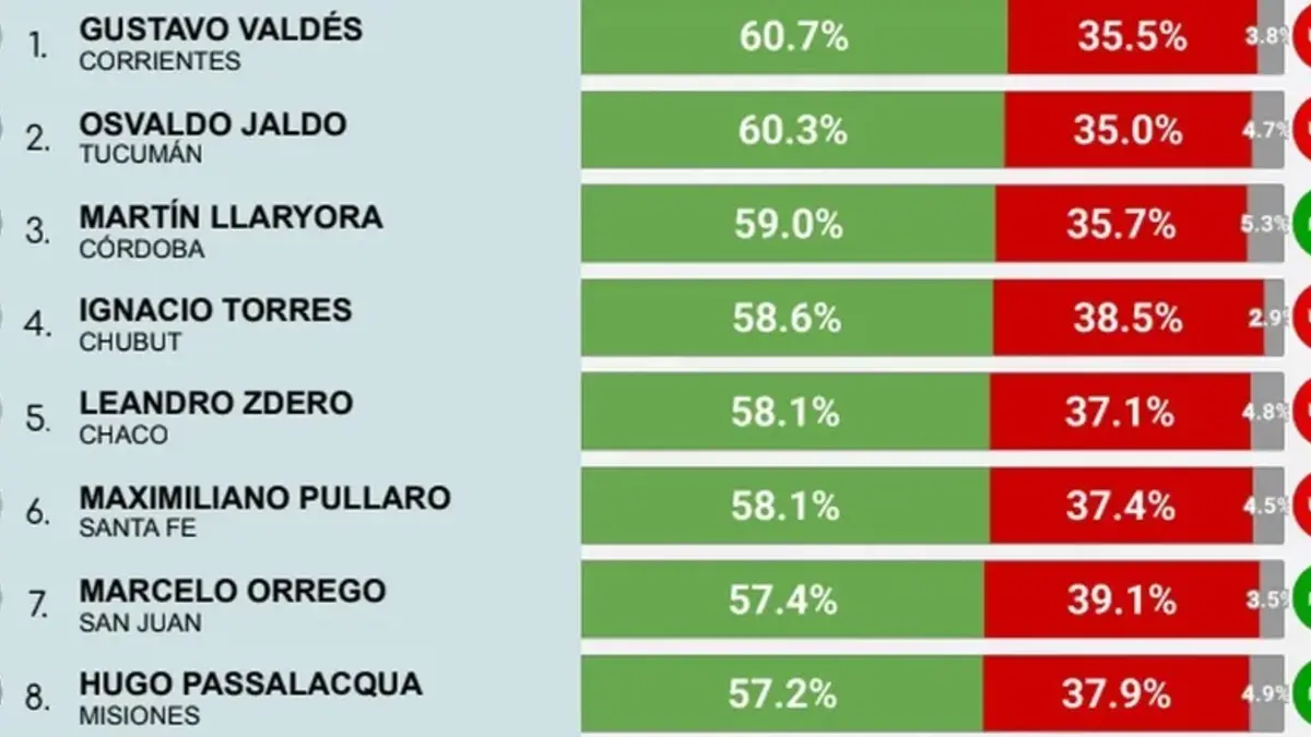 El gobernador de Corrientes, Gustavo Valdés, obtuvo una imagen positiva del 60,7%, posicionándose como el mandatario provincial con mayor aprobación del país. Lo sigue de cerca el gobernador de Tucumán, Osvaldo Jaldo, con un 60,3%, y el cordobés Martín Llaryora, con un 59%.