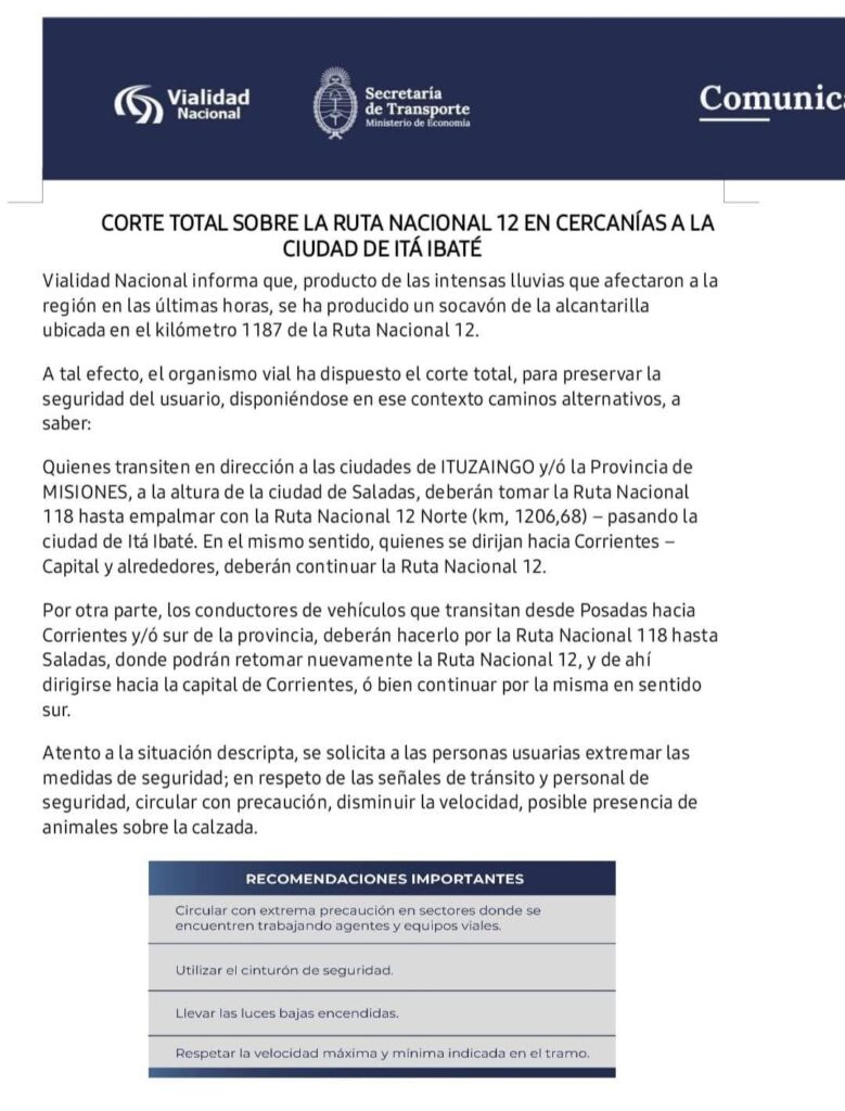 Vialidad Nacional informa que la ruta nacional 12 a la altura de Itá Ibaté se encuentra totalmente cortada al tránsito por el riesgo de derrumbe de un puente
