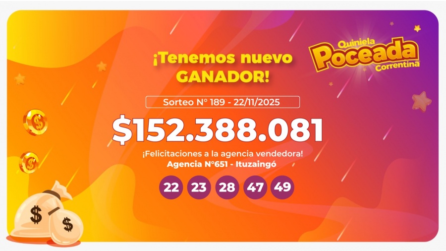 La jugada ganadora fue realizada en la agencia oficial N°651 de Ituzaingó, donde el afortunado eligió la combinación 22 – 23 – 28 – 47 – 49, que le dió el premio mayor. El